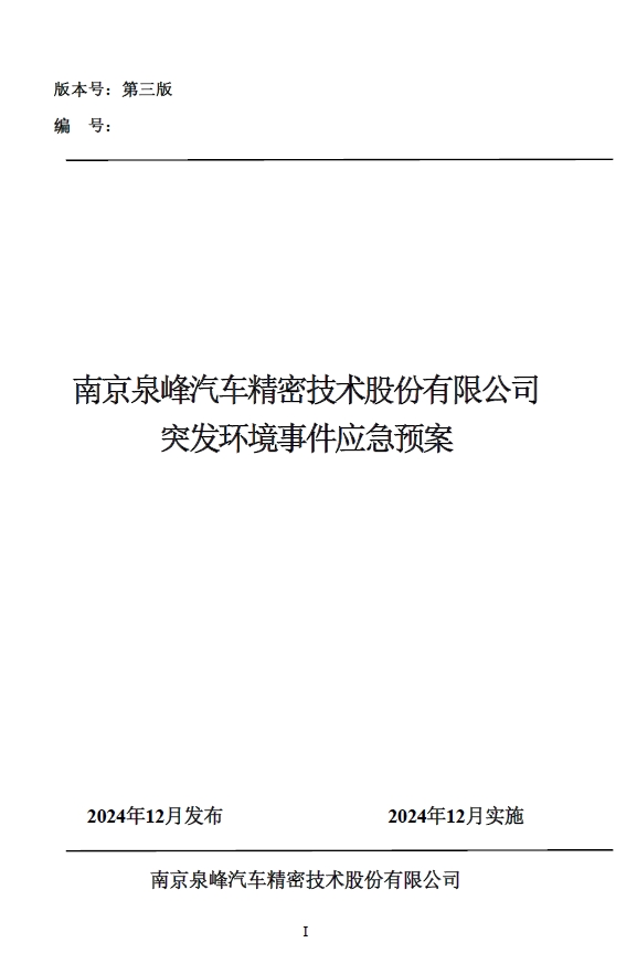 南京泉峰汽車精密技術(shù)股份有限公司突發(fā)環(huán)境事件應(yīng)急預(yù)案報告全本公示